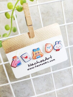 Asymmetrical earrings (where one earring is different than the other) is currently one my favorite things, which is what inspired me to create this set of studs. They're made from shrink plastic and uv resin. You can mix and match your favorites and wear a different pair every day of the week!